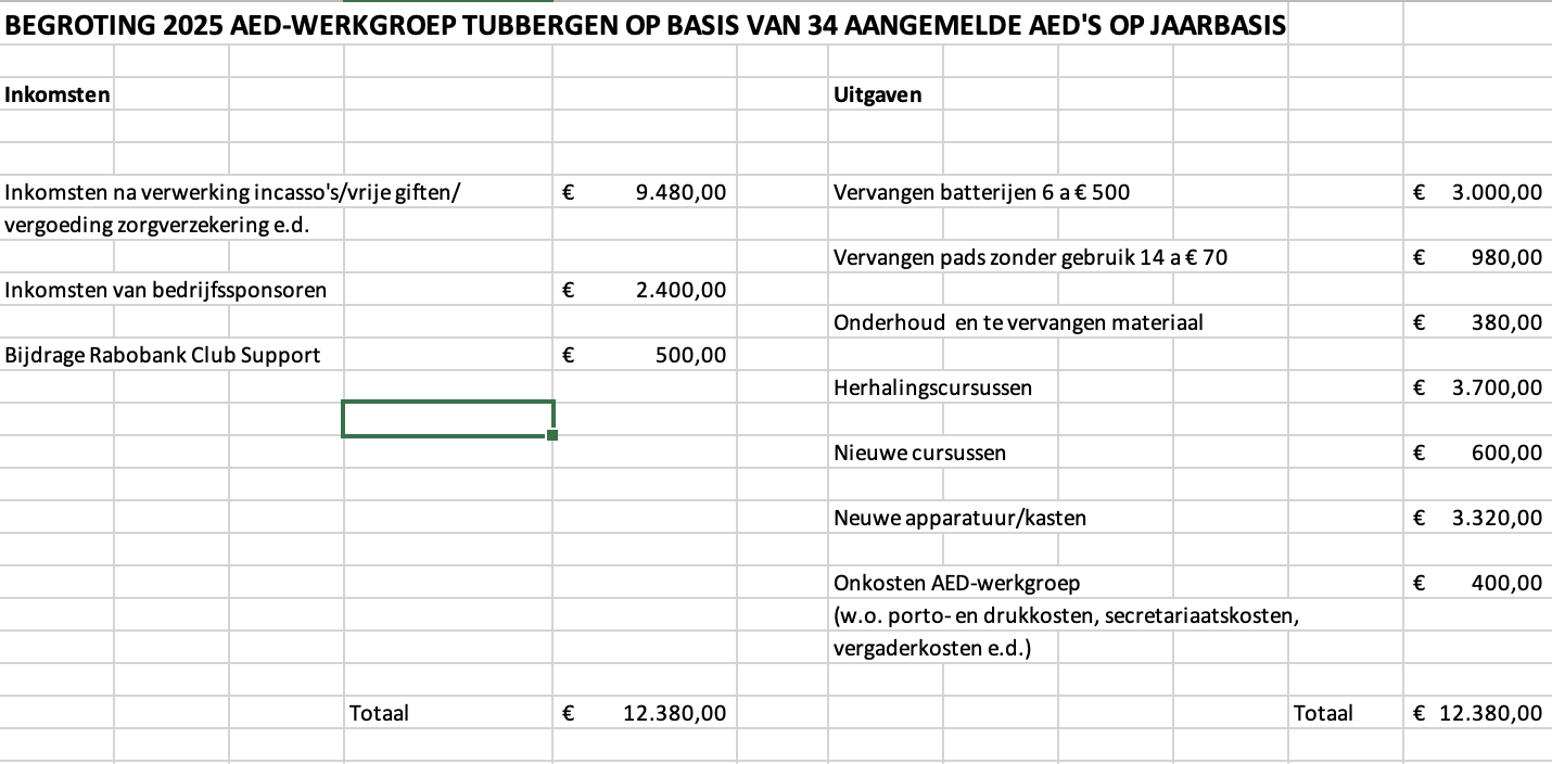 Door de opbrengst van de donateursactie kunnen wij alle aangemelde AED-apparaten van onderhoud voorzien, nieuwe pads en batterijen aanschaffen waar nodig en de herhalingslessen blijven verzorgen zonder dat de cursisten dit zelf hoeven te betalen. Ook hopen we elk jaar nog een nieuw groepje op te kunnen leiden zodat we een goede dekkingsgraad van hulpverleners behouden blijft in Tubbergen.